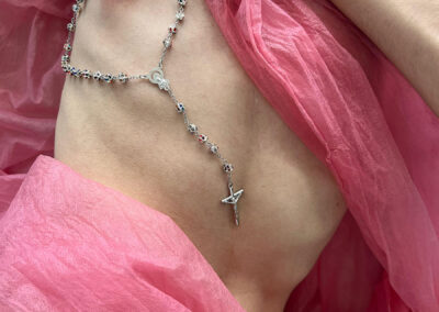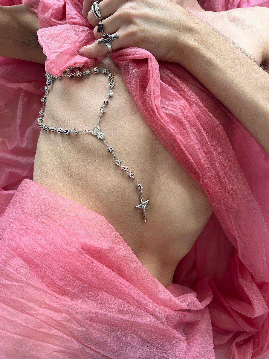 Joël Müller, geboren 1998 in Mainz, lebt, arbeitet und studiert auch in Mainz. Seine Textilarbeiten fokussieren sich auf eine queere Perspektive auf kirchliche Strukturen und auf die Popkultur der letzten Jahrzehnte. In seinen Rauminstallationen behandelt er den Versuch des Festklammerns an Erinnerungen und dem häufig unumgehbaren Prozess des Verschwimmens und Verlierens seiner Erinnerungen.